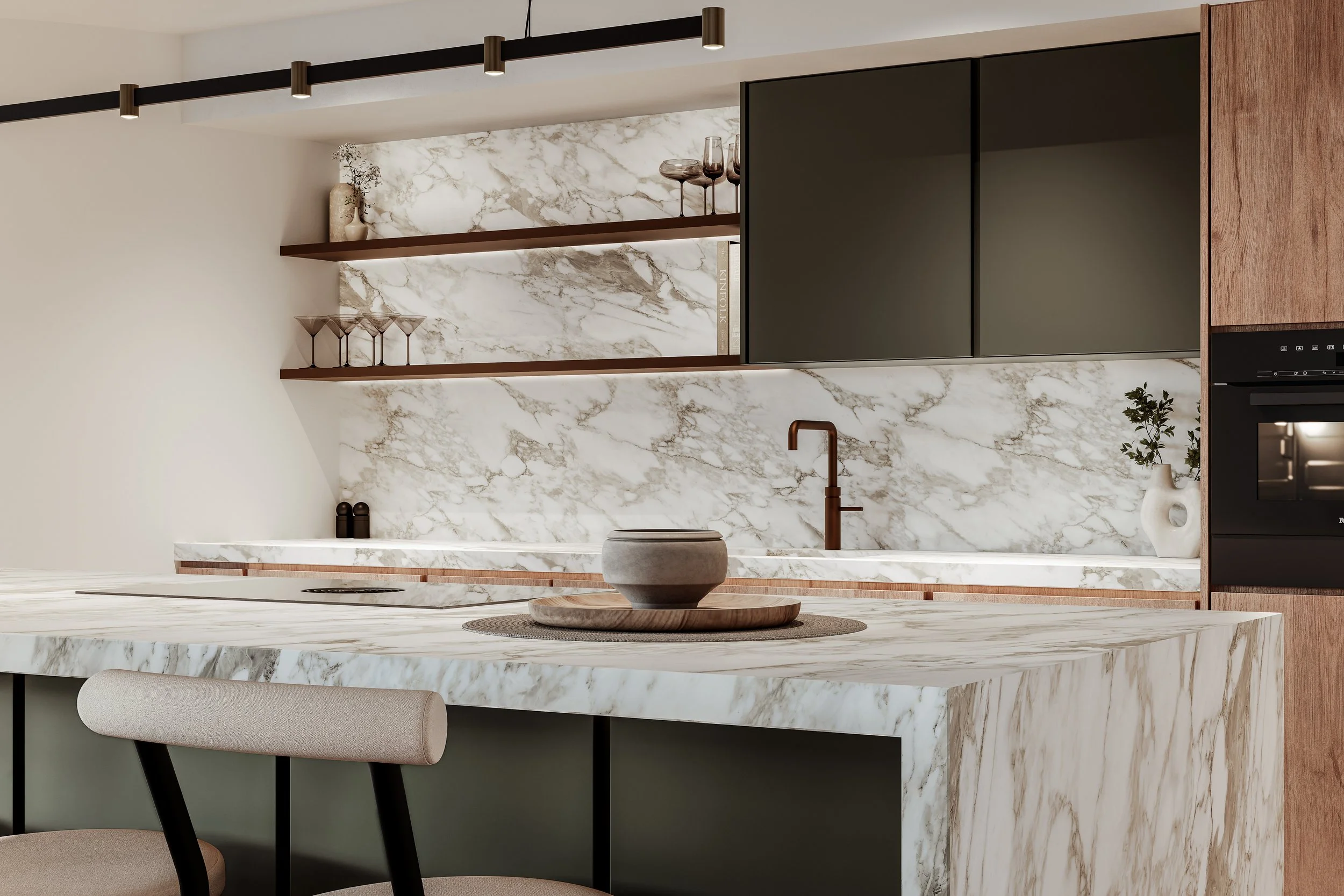• Quartz countertop with elegant mitred edges and matching full-height splashback