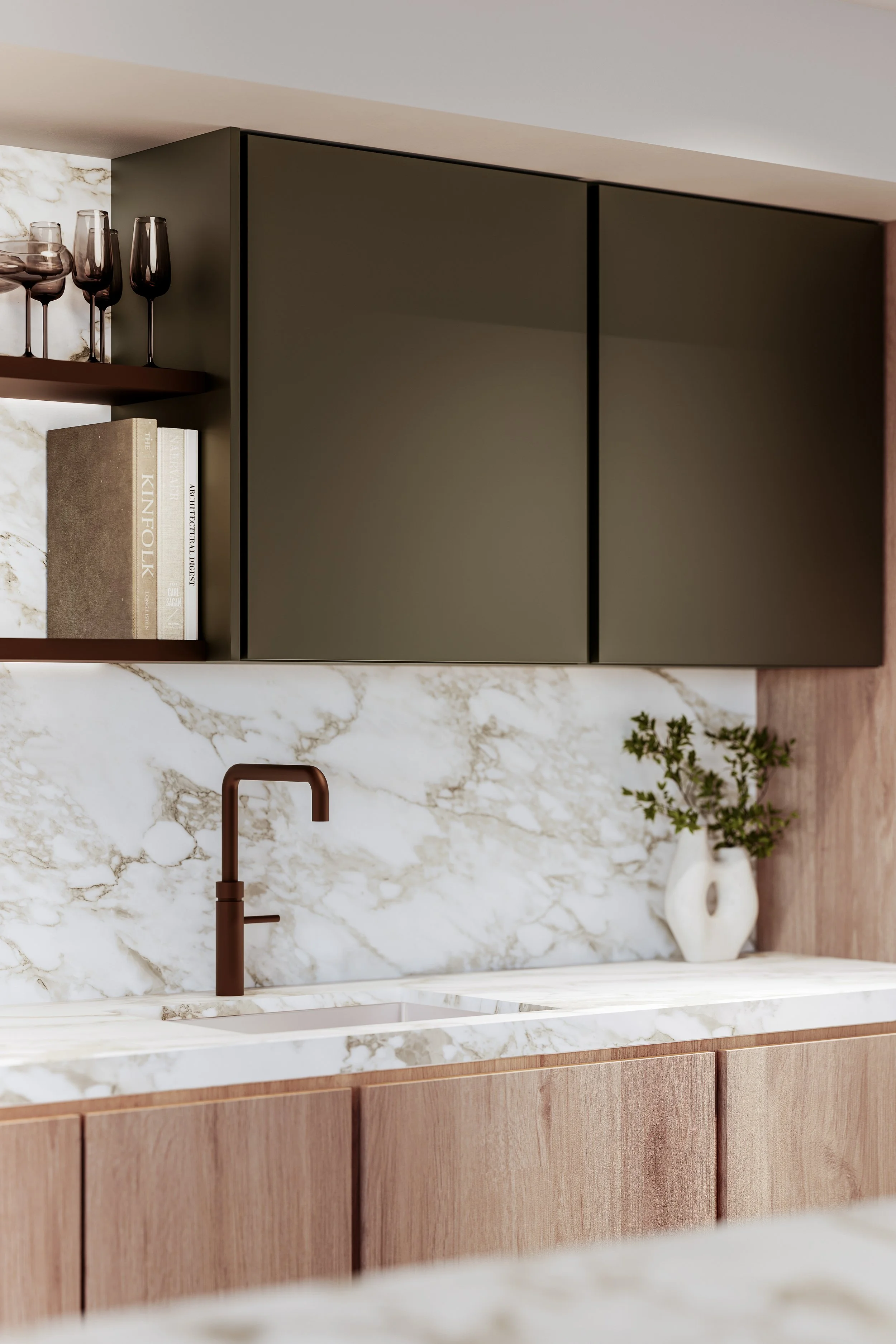 • Quartz countertop with elegant mitred edges and matching full-height splashback